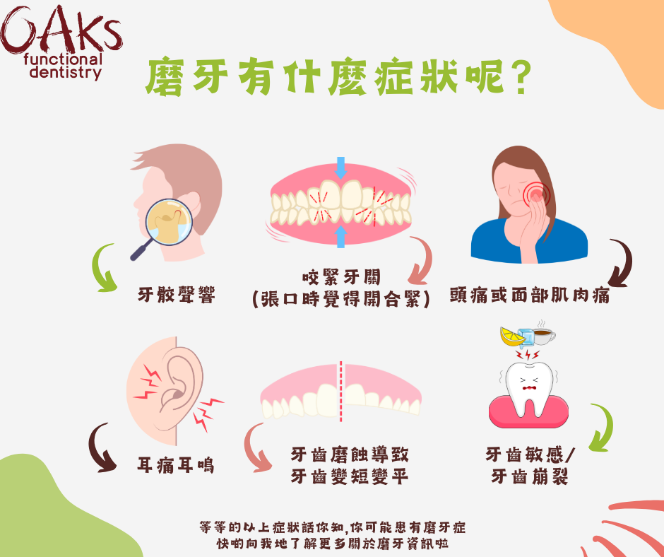磨牙的力量會直接施加於我們的顳顎關節(即是牙骹)上。這個關節如長期承受不當壓力,會導致關盤移位、軟組織發炎及韌帶拉傷,從而引發關節區疼痛、開合口出現聲響或卡住。