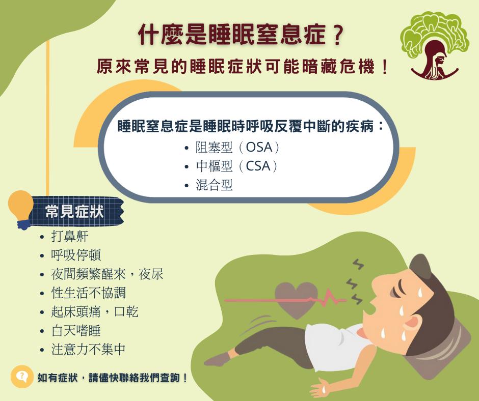 睡眠窒息症是睡眠時呼吸反复中斷的疾病,可分為: